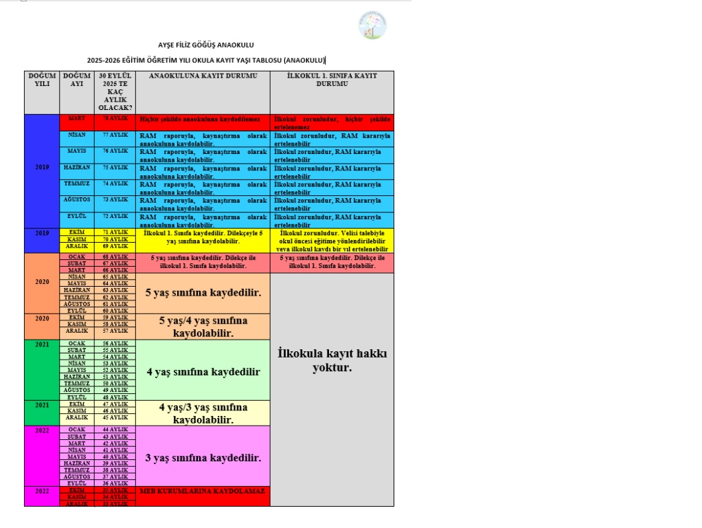 2025-2026 EĞİTİM ÖĞRETİM YILI KAYIT YAŞI TABLOSU (ANAOKULU)